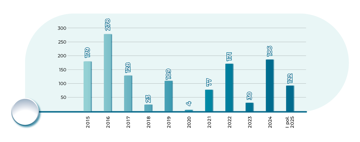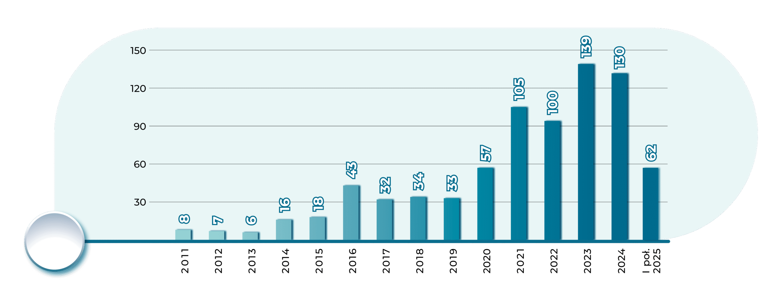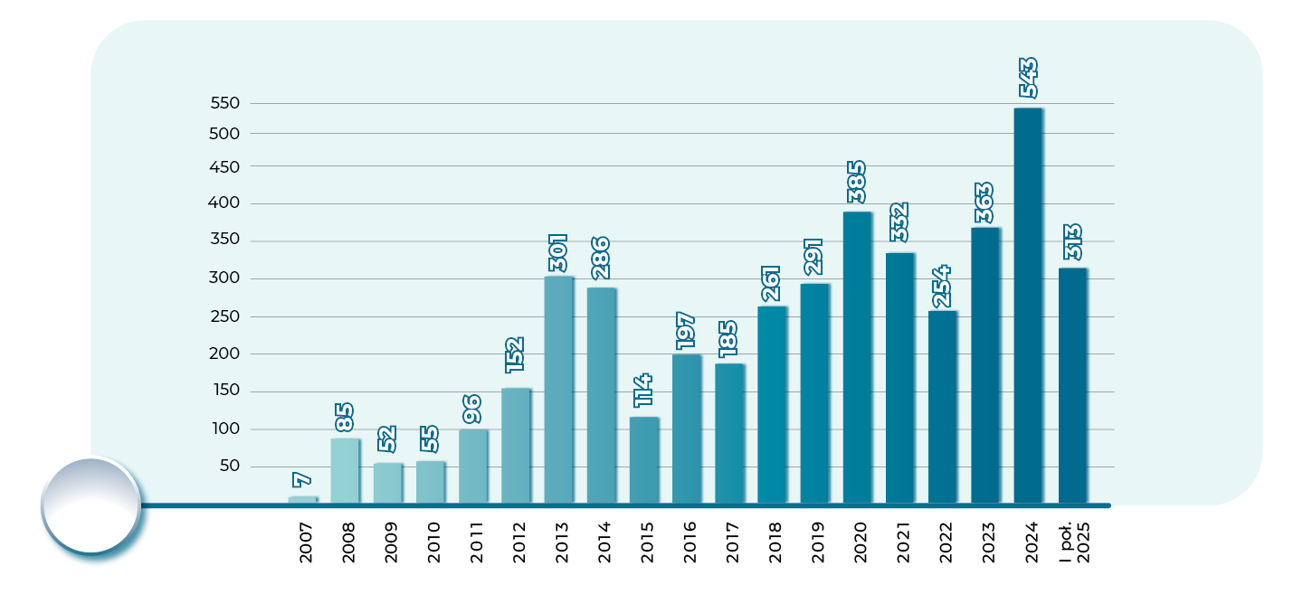 Wykres stanowi odzwierciedlenie liczby zleceń zrealizowanych w okresie 2007-I połowa 2025. Na niebieskim tle roztacza się wykres słupkowy. Na osi pionowej dookreślono podziałkę liczbową. Na osi poziomej widoczna jest podziałka w odniesieniu do lat. W 2007 r. zrealizowano 7 zleceń. W 2008 r. zrealizowano 85 zleceń. W 2009 r. zrealizowano 52 zleceń. W 2010 r. zrealizowano 55 zleceń. W 2011 r. zrealizowano 96 zleceń. W 2012 r. zrealizowano 152 zlecenia. W 2013 r. zrealizowano 301 zleceń. W 2014 r. zrealizowano 286 zleceń. W 2015 r. zrealizowano 114 zleceń. W 2016 r. zrealizowano 197 zleceń. W 2017 r. zrealizowano 185 zleceń. W 2018 r. zrealizowano 261 zleceń. W 2019 r. zrealizowano 291 zleceń. W 2020 r. zrealizowano 387 zleceń. W 2021 r. zrealizowano 332 zleceń. W 2022 r. zrealizowano 255 zleceń. W 2023 r. zrealizowano 366 zleceń. W 2024 r. zrealizowano 543 zleceń. W pierwszej połowie 2025 r. zrealizowano 313 zleceń.