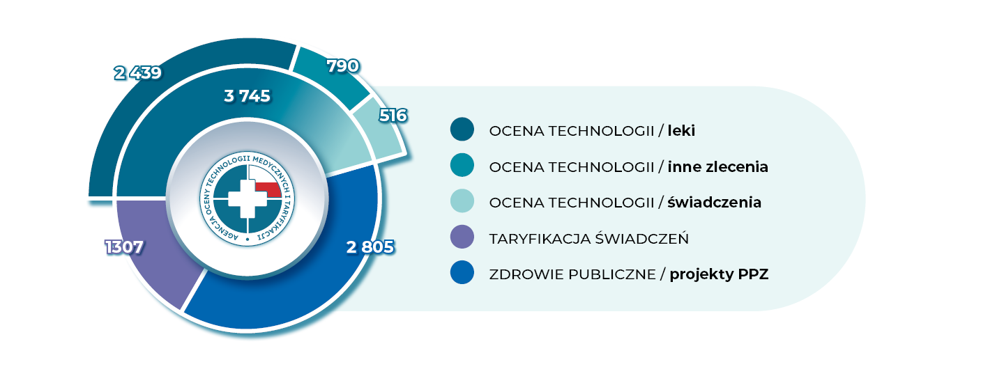 Grafika prezentuje realizację zadań AOTMiT w latach 2007-I połowa 2025 wynikająca ze zleceń Ministra Zdrowia jak i zadań wynikających z ustawy o świadczeniach opieki zdrowotnej. Po środku grafiki umieszczono logotyp Agencji. Wokół logotypu znajduje się krąg. Wokół kręgu roztacza się kolejny krąg podzielony na trzy obszary różniące się kolorem, mającym na celu zachowanie różnicy w zakresie opisywanych treści. Obszar pierwszy tego kręgu (największy) odnosi się do liczby 3745 - jako sumy analiz dla technologii lekowych i nielekowych. Następnie widzimy liczbę 1307 odpowiadającą liczbie sporządzonych taryf oraz liczbę 2805, jako liczbę zaopiniowanych, nadesłanych projektów Programów Polityki Zdrowotnej, głównie przez Jednostki Samorządu Terytorialnego. Następnie widoczny jest ostatni od zewnętrznej strony krąg na którym znajdują się 3 liczby 2439 - tj. ocena zleceń dot. leków oraz liczba 790 - jako inne zadania zlecone przez Ministra Zdrowia i liczba 516 - jako analizy związane z oceną świadczeń opieki zdrowotnej.