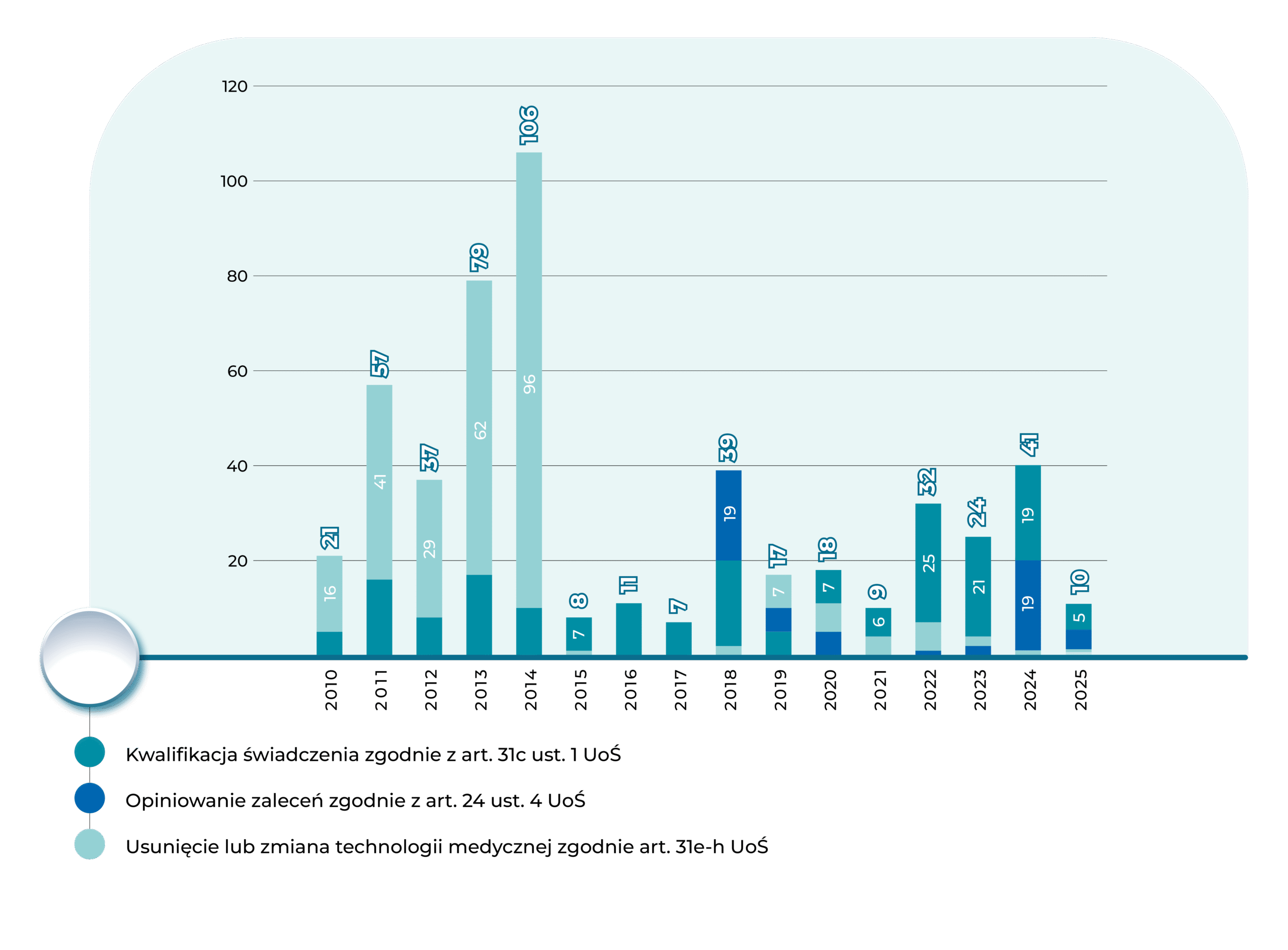 Wykres przedstawia dynamikę realizowanych zleceń z zakresu oceny świadczeń opieki zdrowotnej w podziale na podstawę prawną zlecenia w latach 2010 – I połowa 2025 r. Na niebieskim tle roztacza się wykres słupkowy. Na osi pionowej dookreślono podziałkę liczbową. Na osi poziomej widoczna jest podziałka w odniesieniu do lat. W 2010 r. zrealizowano 21 zleceń (16 dotyczyło usunięcia lub zmiany technologii medycznej zgodnie z art. 31-h UoŚ). W 2011 r. zrealizowano 57 zleceń (41 dotyczyło usunięcia lub zmiany technologii medycznej zgodnie z art. 31-h UoŚ). W 2012 r. zrealizowano 37 zleceń (29 dotyczyło usunięcia lub zmiany technologii medycznej zgodnie z art. 31-h UoŚ). W 2013 r. zrealizowano 79 zleceń (62 dotyczyło usunięcia lub zmiany technologii medycznej zgodnie z art. 31-h UoŚ). W 2014 r. zrealizowano 106 zleceń (96 dotyczyło usunięcia lub zmiany technologii medycznej zgodnie z art. 31-h UoŚ). W 2015 r. zrealizowano 8 zleceń (7 dotyczyło kwalifikacji świadczenia zgodnie z art. 31c ust. 1 UoŚ). W 2016 r. zrealizowano 11 zleceń o kwalifikacji świadczenia zgodnie z art. 31c ust. 1 UoŚ. W 2017 r. zrealizowano 7 zleceń o kwalifikacji świadczenia zgodnie z art. 31c ust. 1 UoŚ. W 2018 r. zrealizowano 39 zleceń (19 dotyczyło opiniowania zaleceń zgodnie z art. 24 ust. 4 UoŚ). W 2019 r. zrealizowano 17 zleceń (7 dotyczyło usunięcia lub zmiany technologii medycznej zgodnie z art. 31-h UoŚ). W 2020 r. zrealizowano 18 zleceń (7 dotyczyło kwalifikacji świadczenia zgodnie z art. 31c ust. 1 UoŚ). W 2021 r. zrealizowano 10 zleceń (6 dotyczyło kwalifikacji świadczenia zgodnie z art. 31c ust. 1 UoŚ). W 2022 r. zrealizowano 32 zlecenia (25 dotyczyło kwalifikacji świadczenia zgodnie z art. 31c ust. 1 UoŚ). W 2023 r. zrealizowano 25 zleceń (21 dotyczyło kwalifikacji świadczenia zgodnie z art. 31c ust. 1 UoŚ). W 2024 r. zrealizowano 12 zleceń (6 dotyczyło kwalifikacji świadczenia zgodnie z art. 31c ust. 1 UoŚ). W I połowie 2025 r. zrealizowano 10 zleceń (5 dotyczyło kwalifikacji świadczenia zgodnie z art. 31c ust. 1 UoŚ).