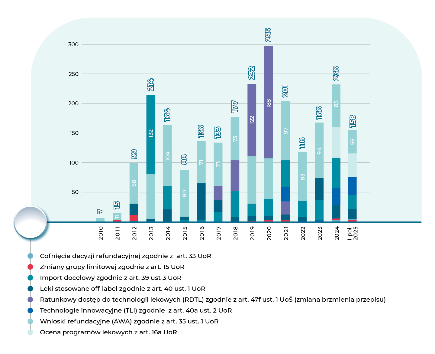 Wykres przedstawia dynamikę realizowanych zleceń z zakresu technologii lekowych w podziale na podstawę prawną zlecenia w latach 2010- I połowa 2025 r. Na niebieskim tle roztacza się wykres słupkowy. Na osi pionowej dookreślono podziałkę liczbową. Na osi poziomej widoczna jest podziałka w odniesieniu do lat. Na wykresach przedstawiono dane dotyczące zleceń o największej liczbie realizacji. W 2010 r. zrealizowano 7 zleceń (dotyczyło wniosków refundacyjnych (AWA) zgodnie z art. 35 ust. 1 UoR). W 2011 r. zrealizowano 15 zleceń (11 dotyczyło wniosków refundacyjnych (AWA) zgodnie z art. 35 ust. 1 UoR). W 2012 r. zrealizowano 99 zleceń (68 dotyczyło wniosków refundacyjnych (AWA) zgodnie z art. 35 ust. 1 UoR). W 2013 r. zrealizowano 214 zleceń (132 dotyczyło importu docelowego zgodnie z art. 39 ust 3 UoR). W 2014 r. zrealizowano 164 zlecenia (104 dotyczyło wniosków refundacyjnych (AWA) zgodnie z art. 35 ust. 1 UoR). W 2015 r. zrealizowano 88 zleceń (80 dotyczyło wniosków refundacyjnych (AWA) zgodnie z art. 35 ust. 1 UoR). W 2016 r. zrealizowano 136 zleceń (71 dotyczyło wniosków refundacyjnych (AWA) zgodnie z art. 35 ust. 1 UoR). W 2017 r. zrealizowano 133 zlecenia (73 dotyczyło wniosków refundacyjnych (AWA) zgodnie z art. 35 ust. 1 UoR). W 2018 r. zrealizowano 177 zleceń (73 dotyczyło wniosków refundacyjnych (AWA) zgodnie z art. 35 ust. 1 UoR). W 2019 r. zrealizowano 232 zlecenia (122 dotyczyło ratunkowego dostępu do technologii lekowych (RDTL) zgodnie z art. 47f ust. 1 UoŚ (zmiana brzmienia przepisu)). W 2020 r. zrealizowano 295 zleceń (188 dotyczyło ratunkowego dostępu do technologii lekowych (RDTL) zgodnie z art. 47f ust. 1 UoŚ (zmiana brzmienia przepisu)). W 2021 r. zrealizowano 201 zleceń (97 dotyczyło wniosków refundacyjnych (AWA) zgodnie z art. 35 ust. 1 UoR). W 2022 r. zrealizowano 118 zleceń (83 dotyczyło wniosków refundacyjnych (AWA) zgodnie z art. 35 ust. 1 UoR). W 2023 r. zrealizowano 168 zleceń (94 dotyczyło wniosków refundacyjnych (AWA) zgodnie z art. 35 ust. 1 UoR). W 2024 r. zrealizowano 236 zleceń ( 85 dotyczyło wniosków refundacyjnych (AWA) zgodnie z art. 35 ust. 1 UoR). W pierwszej połowie 2025 r. zrealizowano 158 zleceń (55 dotyczyło wniosków refundacyjnych (AWA) zgodnie z art. 35 ust. 1 UoR).